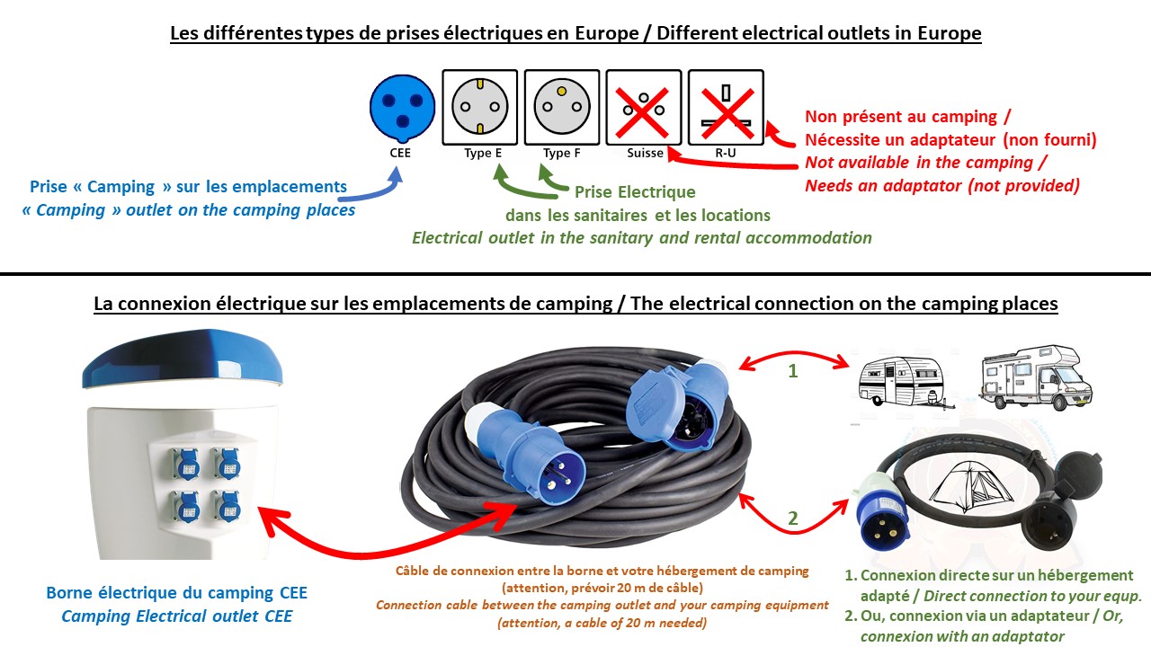 - Electrical connection: Only with a cable with a CEE standard plug, waterproof. Preferably 25 m long. Possibility of loaning a long cable at reception against a deposit of €20. See image here.