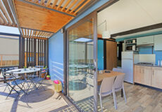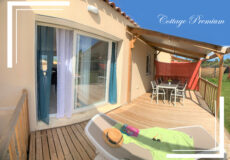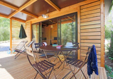 Mobilhome tout neuf d’une superficie de 26 m² équipé pour 5 personnes, avec terrasse de 8 m² et jardin.
