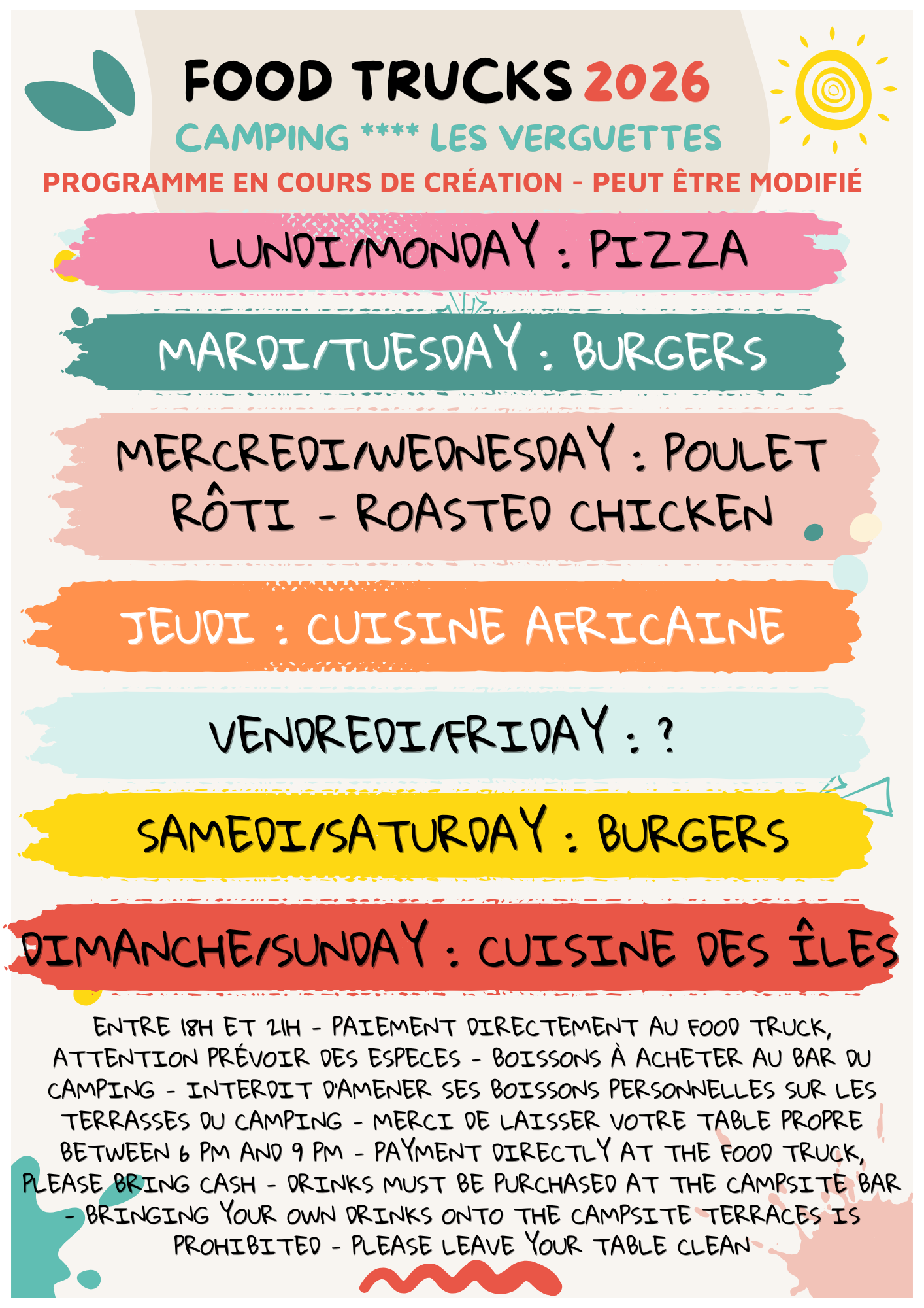 Let op voor 2026: 3, 10 en 17 augustus: De pizzatruck is afwezig; er wordt gezocht naar een vervanger. De bar sluit vanaf zaterdag 22 augustus om 19:00 uur.